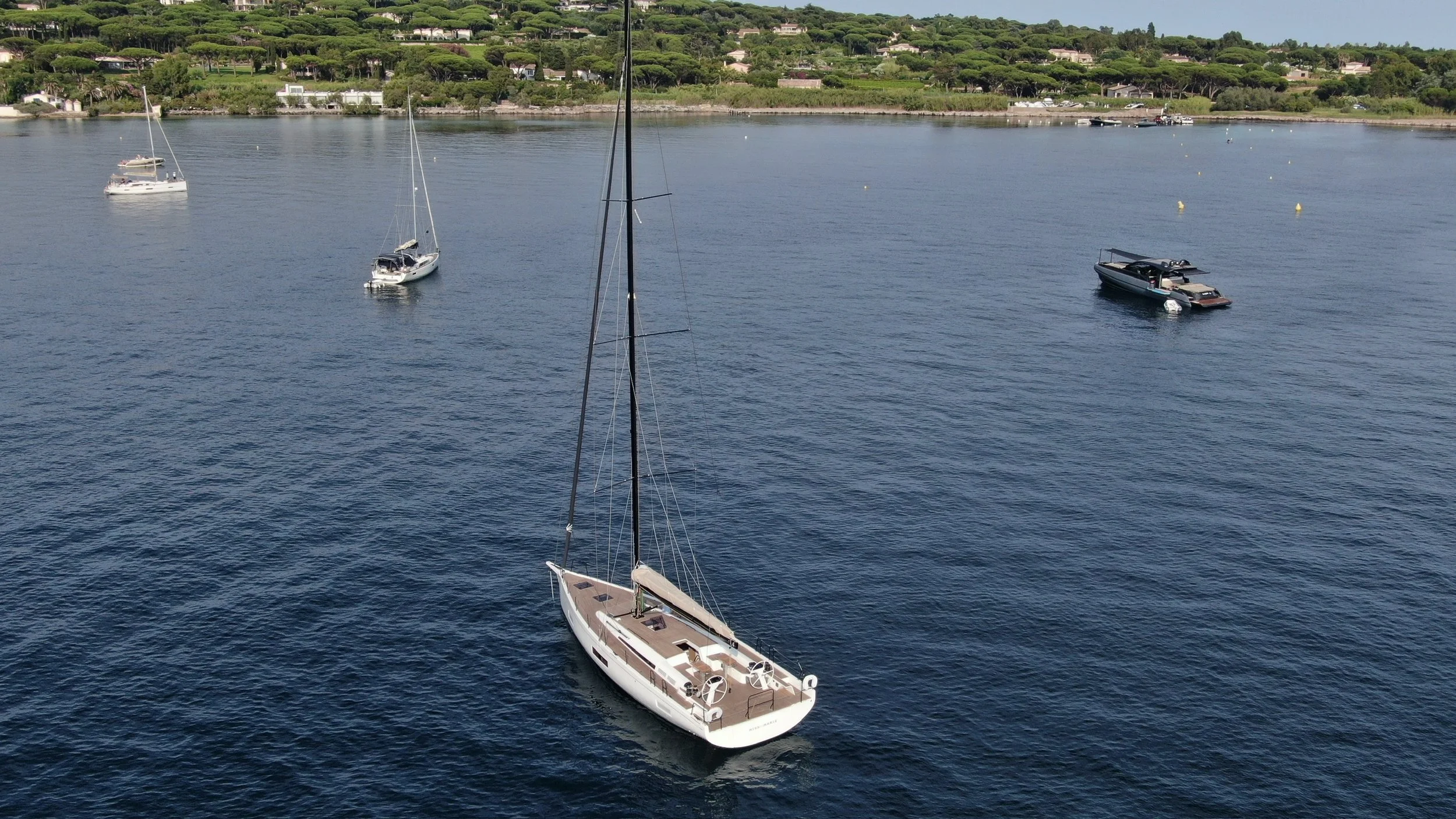 Aerial view of miss marie first 53 on calm water in costa Smeralda